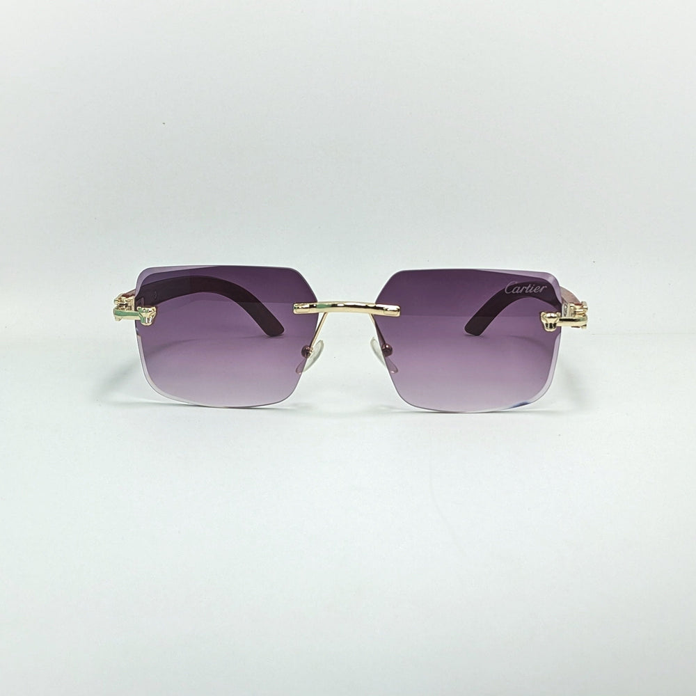 Colour: Coloured Puprle pink lenses (no frame rim), all visible hardware is polished Gold-tone metal. Temple tips are black/dark brown.
